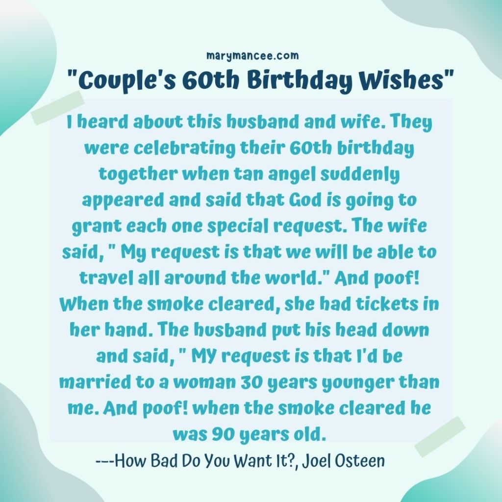 I heard about this husband and wife. They were celebrating their 60th birthday together when tan angel suddenly appeared and said that God is going to grant each one special request. The wife said, ” My request is that we will be able to travel all around the world.” And poof! When the smoke cleared, she had tickets in her hand. The husband put his head down and said, ” MY request is that I’d be married to a woman 30 years younger than me. And poof! when the smoke cleared he was 90 years old. –How Bad Do You Want It?, Joel Osteen