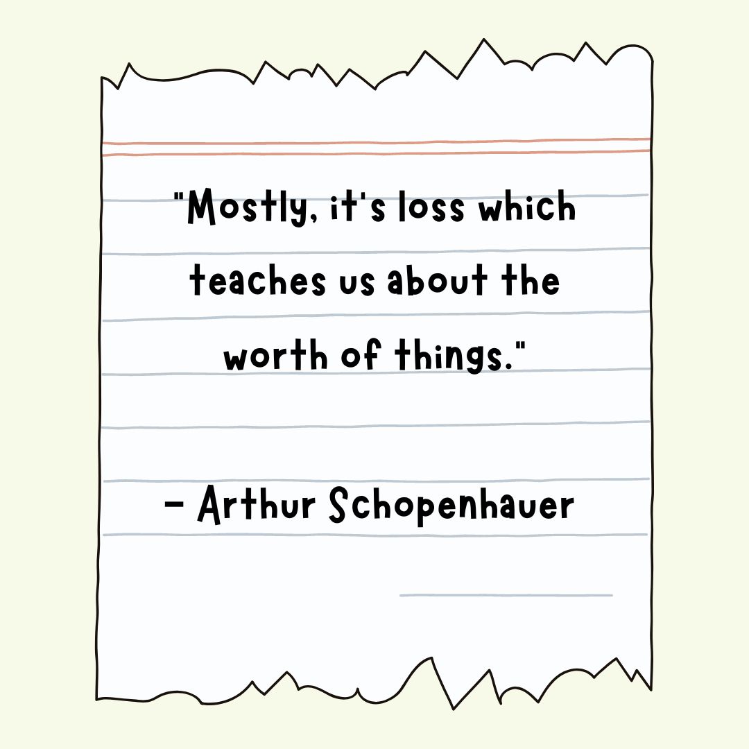 “Mostly, it’s loss which teaches us about the worth of things.“- Arthur Schopenhauer From a TV Show [demn it I forgot to put the title and now I can’t remember where I heard this from, but really relate to this when I lost my little brother and then when I realized I had lost someone else and it was the end]