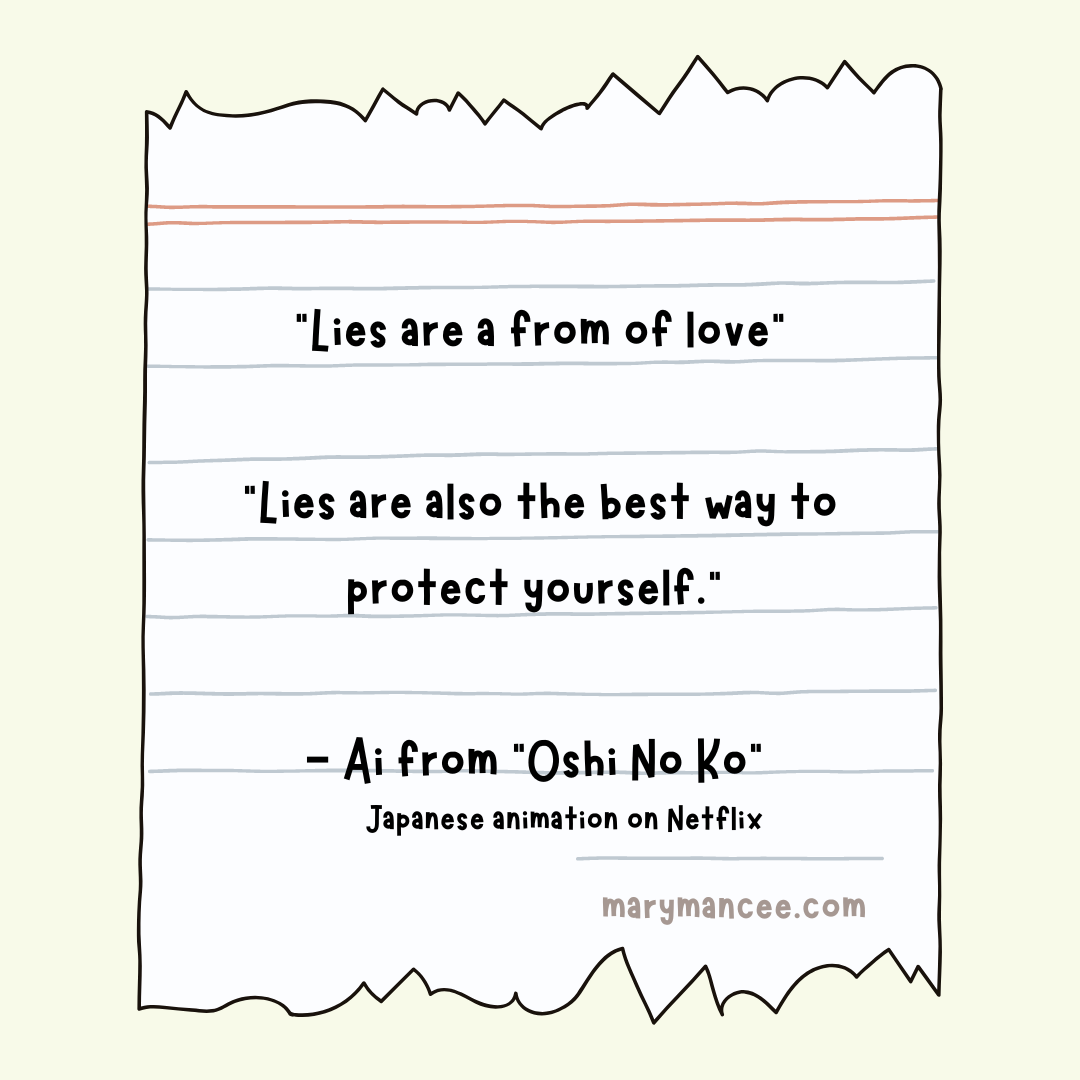 “Lies are a form of LOVE.” “Lies are the best way to protect ourselves.” (Ai, “Oshi No Oko”, June 2023) [Taking it from the perspective of the people who lied to me, I finally understand that lies are sometimes justifiable and necessary.]