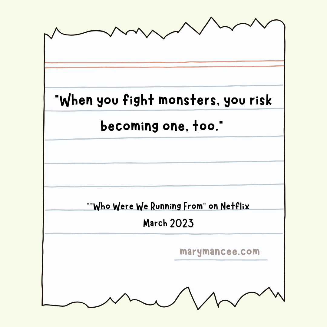 “When you fight monsters, you risk becoming one too.” – “Who Were We Running From” (March 2023) [I once had a coworker I always felt unsafe being around. Mentally, I always had to fight her ways so as I don’t end up becoming like her but then through the years I have been doing so, I have developed a different kind of monster in me.]