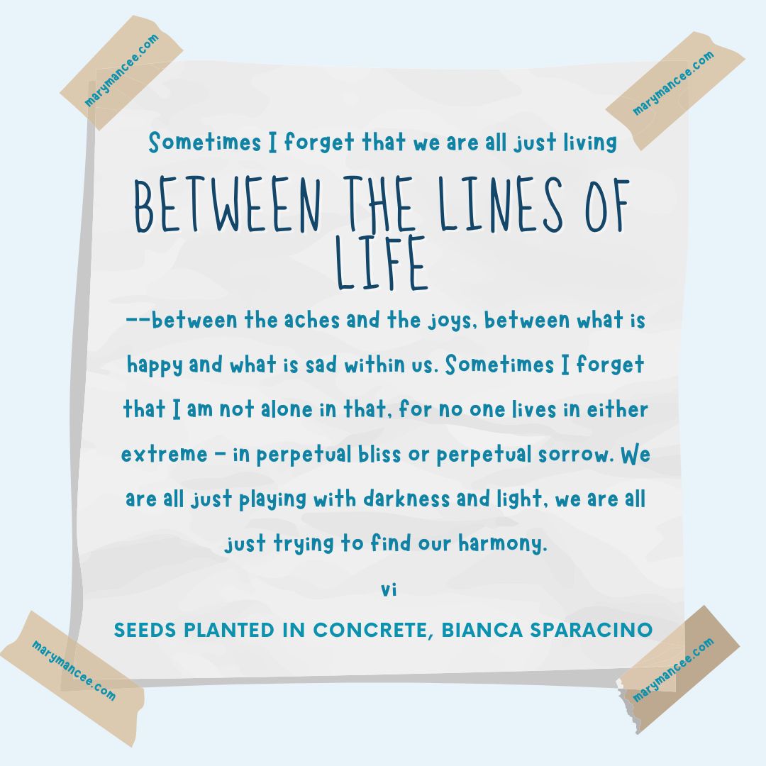 Sometimes I forget that we are all just living BETWEEN THE LINES OF LIFE—between the aches and the joys, between what is happy and what is sad within us. Sometimes I forget that I am not alone in that, for no one lives in either extreme – in perpetual bliss or perpetual sorrow. We are all just playing with darkness and light, we are all just trying to find our harmony.