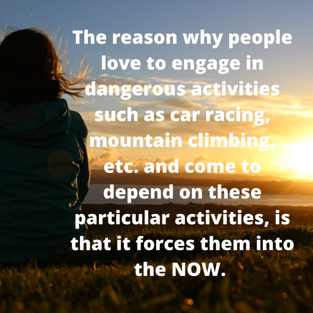 The reason why some people love to engage in dangerous activities, although they may not be aware of it, is that it forces them into the NOW–that intensely alive state that is free of time, free of problems, free of thinking, free of the burden of the personality. Slipping away from the present moment even for a second may mean death. Unfortunately, they come to depend on a particular activity to be in that state. But you don’t need to climb the north face of the Eiger. You can enter the state now. ”