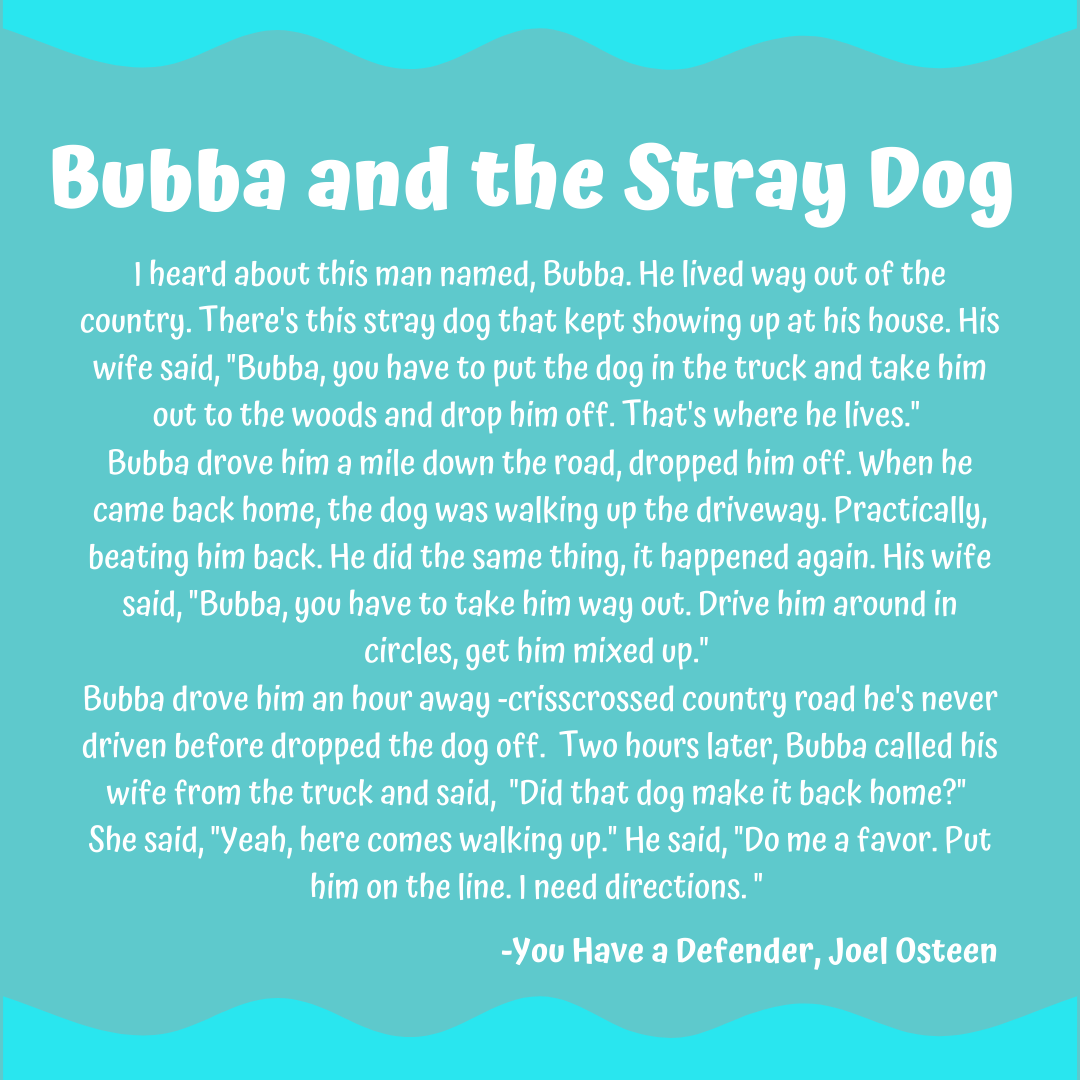 “I heard about this man named, Bubba. He lived way out of the country. There’s this stray dog that kept showing up at his house. His wife said, “Bubba, you have to put the dog in the truck and take him out to the woods and drop him off. That’s where he lives.” Bubba drove him a mile down the road, dropped him off. When he came back home, the dog was walking up the driveway. Practically, beating him back. He did the same thing, it happened again. His wife said, “Bubba, you have to take him way out. Drive him around in circles, get him mixed up.” Bubba drove him an hour away -crisscrossed country road he’s never driven before dropped the dog off. Two hours later, Bubba called his wife from the truck and said, “Did that dog make it back home?” She said, “Yeah, here comes walking up.” He said, “Do me a favor. Put him on the line. I need directions. “–You Have a Defender, Joel Osteen