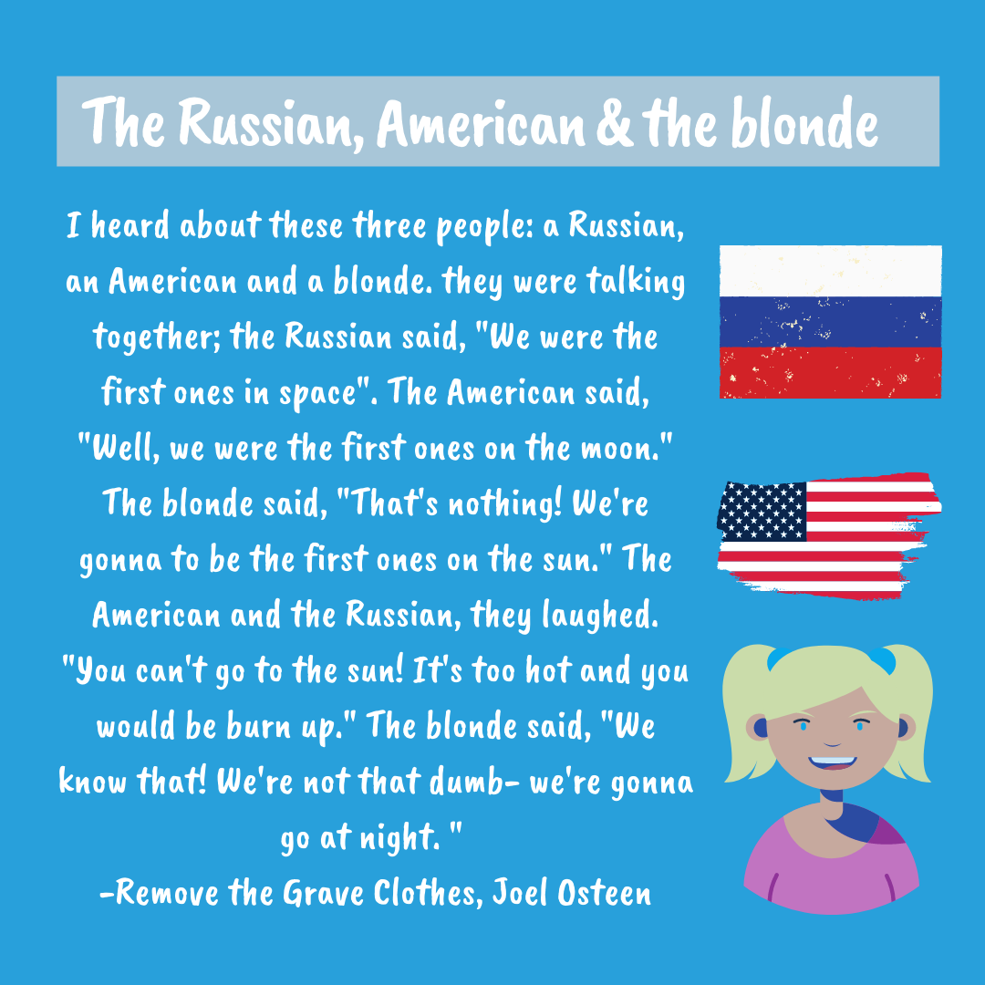I heard about these three people: a Russian, an American and a blonde. they were talking together; the Russian said, “We were the first ones in space”. The American said, “Well, we were the first ones on the moon.” The blonde said, “That’s nothing! We’re gonna to be the first ones on the sun.” The American and the Russian, they laughed. “You can’t go to the sun! It’s too hot and you would be burn up.” The blonde said, “We know that! We’re not that dumb- we’re gonna go at night. ” – Remove the Grave Clothes