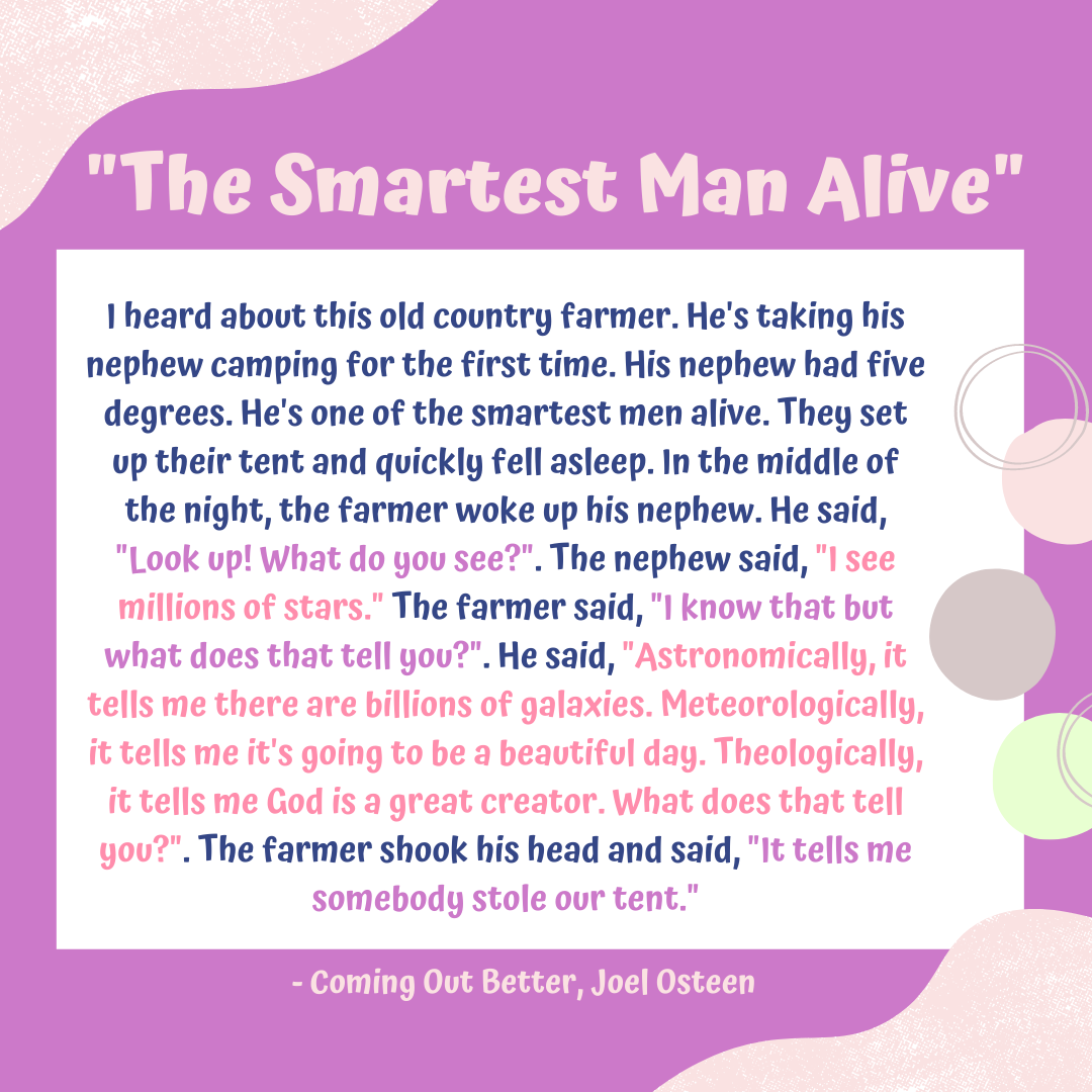 I heard about this old country farmer. He’s taking his nephew camping for the first time. His nephew had five degrees. He’s one of the smartest men alive. They set up their tent and quickly fell asleep. In the middle of the night, the farmer woke up his nephew. He said, “Look up! What do you see?”. The nephew said, “I see millions of stars.” The farmer said, “I know that but what does that tell you?”. He said, “Astronomically, it tells me there are billions of galaxies. Meteorologically, it tells me it’s going to be a beautiful day. Theologically, it tells me God is a great creator. What does that tell you?”. The farmer shook his head and said, “It tells me somebody stole our tent.” -Coming Out Better