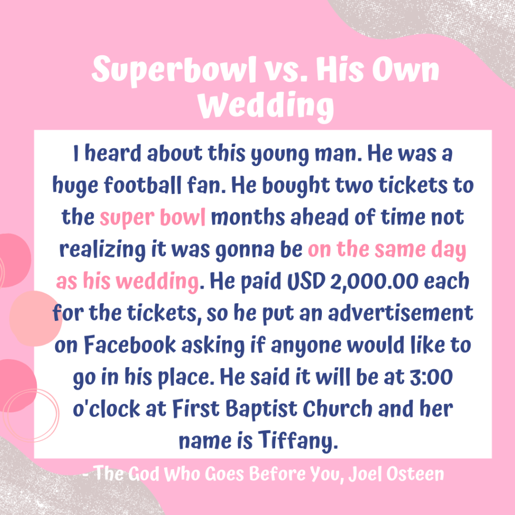 I heard about this young man. He was a huge football fan. He bought two tickets to the super bowl months ahead of time not realizing it was gonna be on the same day as his wedding. He paid USD 2,000.00 each for the tickets, so he put an add on Facebook asking if anyone would like to go in his place. He said it will be at 3:00 o’clock at First Baptist Church and her name is Tiffany. – Joel Osteen, The God Who Goes Before You