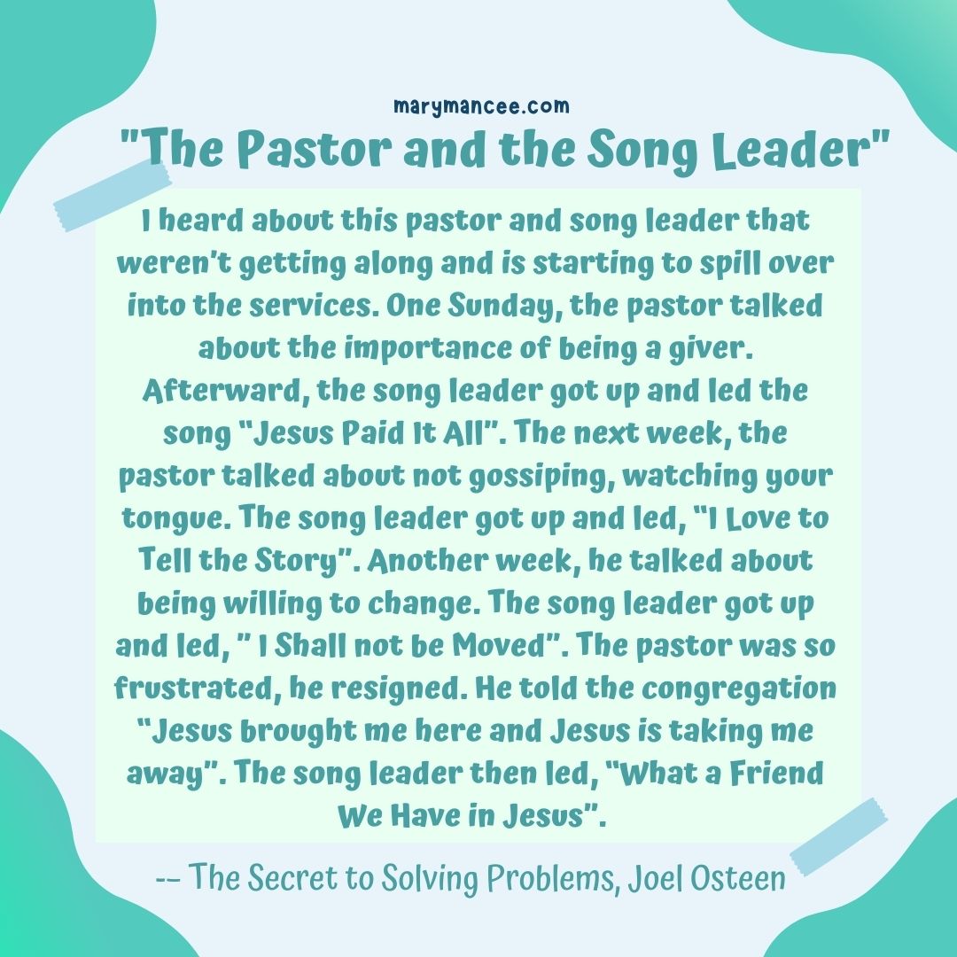 I heard about this pastor and song leader that weren’t getting along and is starting to spill over into the services. One Sunday, the pastor talked about the importance of being a giver. Afterward, the song leader got up and led the song “Jesus Paid It All”. The next week, the pastor talked about not gossiping, watching your tongue. The song leader got up and led, “I Love to Tell the Story”. Another week, he talked about being willing to change. The song leader got up and led, ” I Shall not be Moved”. The pastor was so frustrated, he resigned. He told the congregation “Jesus brought me here and Jesus is taking me away”. The song leader then led, “What a Friend We Have in Jesus”.- The Secret to Solving Problems