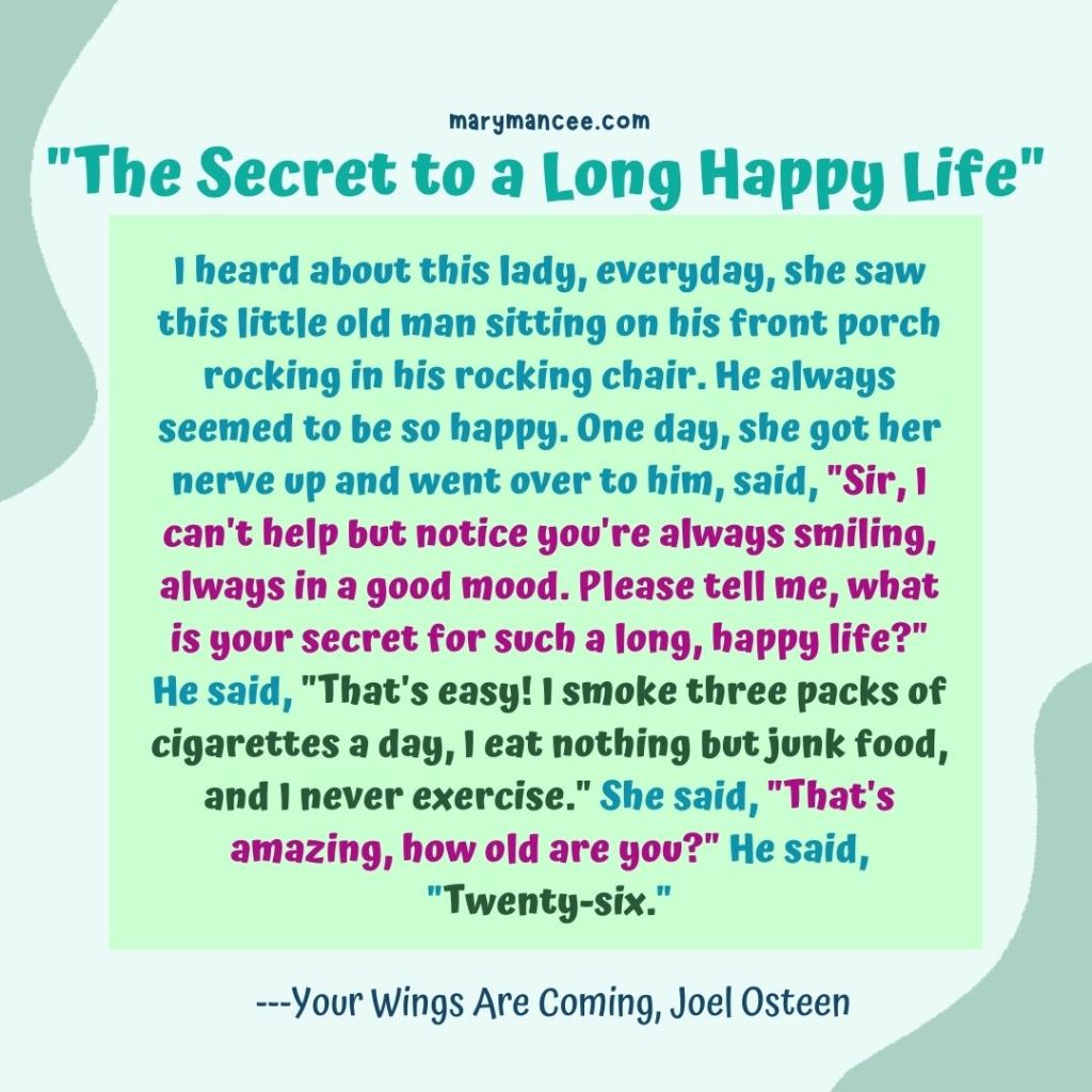 I heard about this lady, everyday, she saw this little old man sitting on his front porch rocking in his rocking chair. He always seemed to be so happy. One day, she got her nerve up and went over to him, said, “Sir, I can’t help but notice you’re always smiling, always in a good mood. Please tell me, what is your secret for such a long, happy life?” He said, “That’s easy! I smoke three packs of cigarettes a day, I eat nothing but junk food, and I never exercise.” She said, “That’s amazing, how old are you?” He said, “Twenty-six.” —Your Wings Are Coming, Joel Osteen