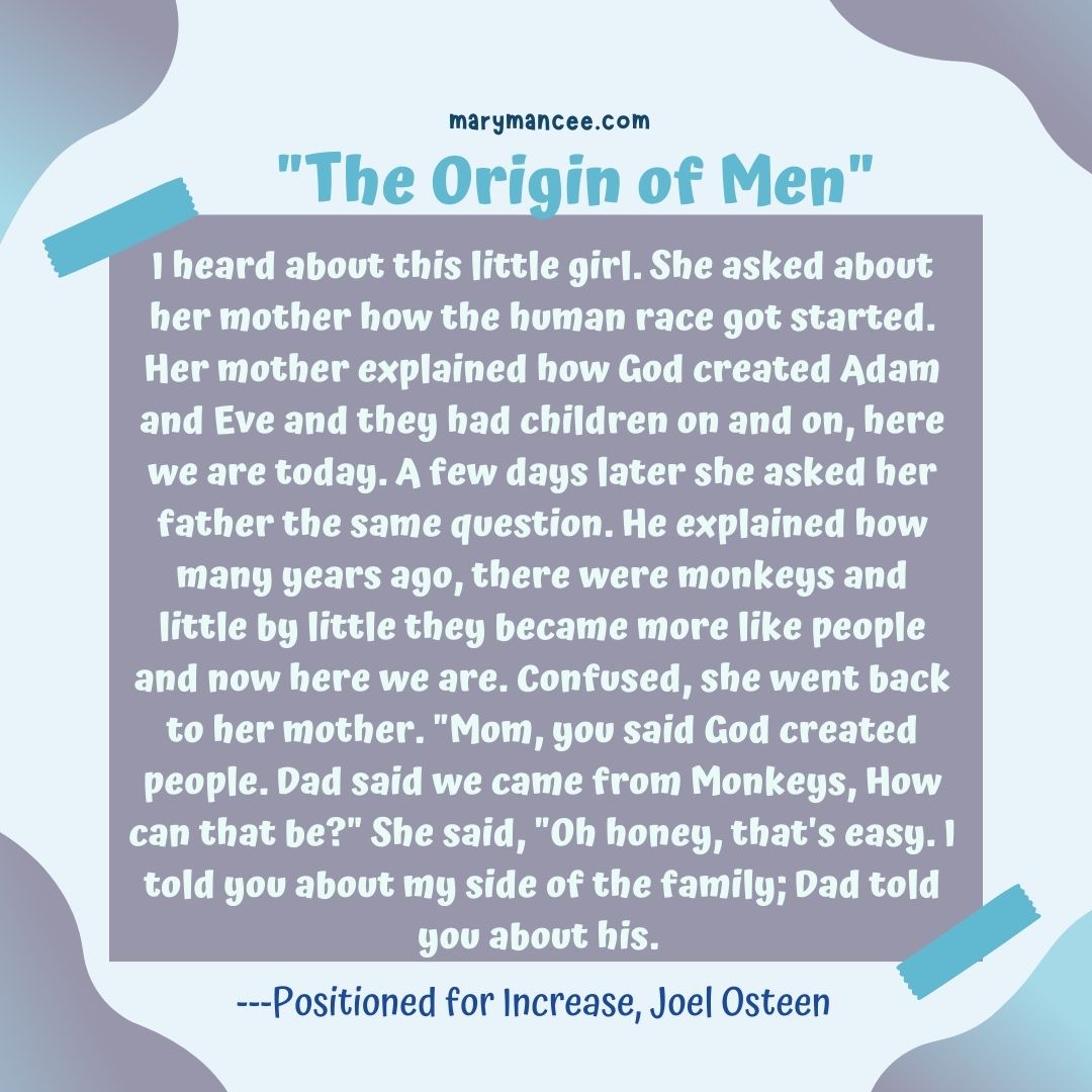 I heard about this little girl. She asked about her mother how the human race got started. Her mother explained how God created Adam and Eve and they had children on and on, here we are today. A few days later she asked her father the same question. He explained how many years ago, there were monkeys and little by little they became more like people and now here we are. Confused, she went back to her mother. “Mom, you said God created people. Dad said we came from Monkeys, How can that be?” She said, “Oh honey, that’s easy. I told you about my side of the family; Dad told you about his. —-Positioned for Increase, Joel Osteen