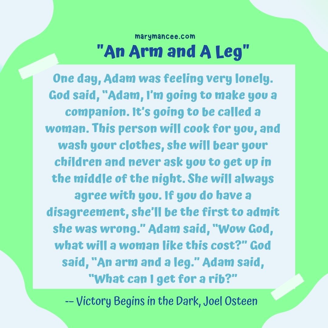 One day, Adam was feeling very lonely. God said, “Adam, I’m going to make you a companion. It’s going to be called a woman. This person will cook for you, and wash your clothes, she will bear your children and never ask you to get up in the middle of the night. She will always agree with you. If you do have a disagreement, she’ll be the first to admit she was wrong.” Adam said, “Wow God, what will a woman like this cost?” God said, “An arm and a leg.” Adam said, “What can I get for a rib?”–Victory Begins in the Dark, Joel Osteen